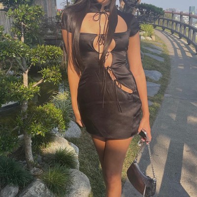 Women's Dress Mock Neck Short Sleeve Tie Front Hollow Out Solid Color Mini Dress