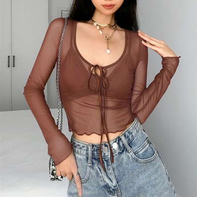 Long-sleeved scoop neck solid color tie mesh cropped T-shirt + bra