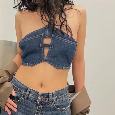 Summer new fashion personality pocket design sense denim tube top strap with hanging neck small vest for women