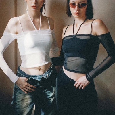 Set: Off-shoulder mesh long-sleeved blouse + halter neck vest