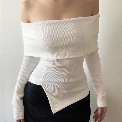 Long Sleeve Off Shoulder Solid Color Slit Knit Top