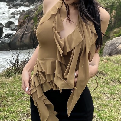 2023 Summer Latest Design Irregular Short Vest Sexy V-neck Ruffle Bow Knot Slim Backless Short Vest Female