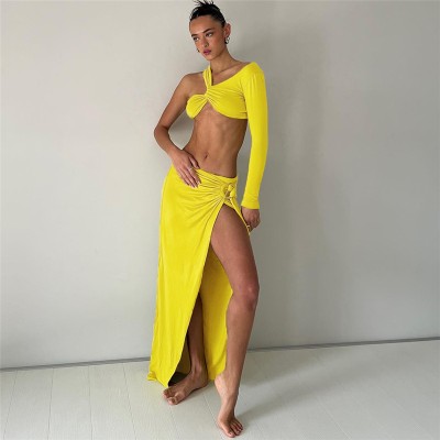 Women's fashionable one-shoulder short navel-baring T-shirt slim slit skirt suit