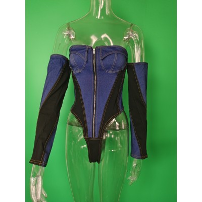patchwork jumpsuits for Women slim zipper denim tops with sleeves